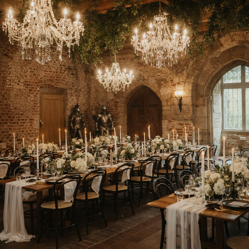 Satte Farben unterstreichen die historische Architektur und verleihen der Hochzeit eine feierliche, hochwertige Ausstrahlung. Besonders in Kombination mit Kerzenlicht, schweren Stoffen und üppigen Blumenarrangements entfaltet dieses Farbdesign seine volle Wirkung.